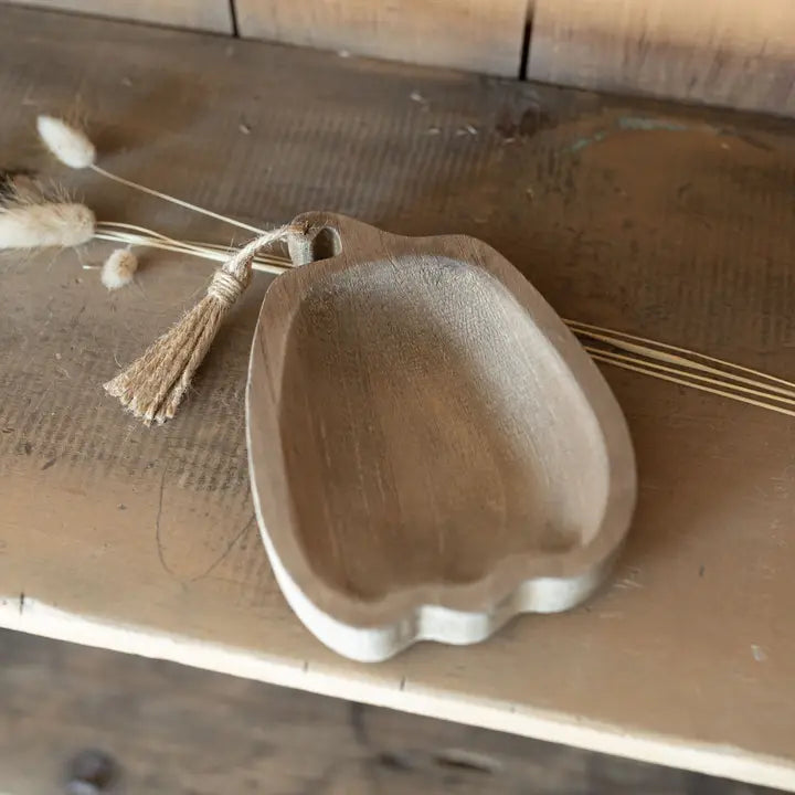 Elevate your home decor with our Carved Wood Pumpkin Trinket Dish. The traditional pumpkin design, crafted from natural wood, and the attached jute tassel exude an air of sophistication. Use this decorative accent to hold your jewelry or add a touch of rustic charm to your coffee table. A perfect addition to your fall decor collection.